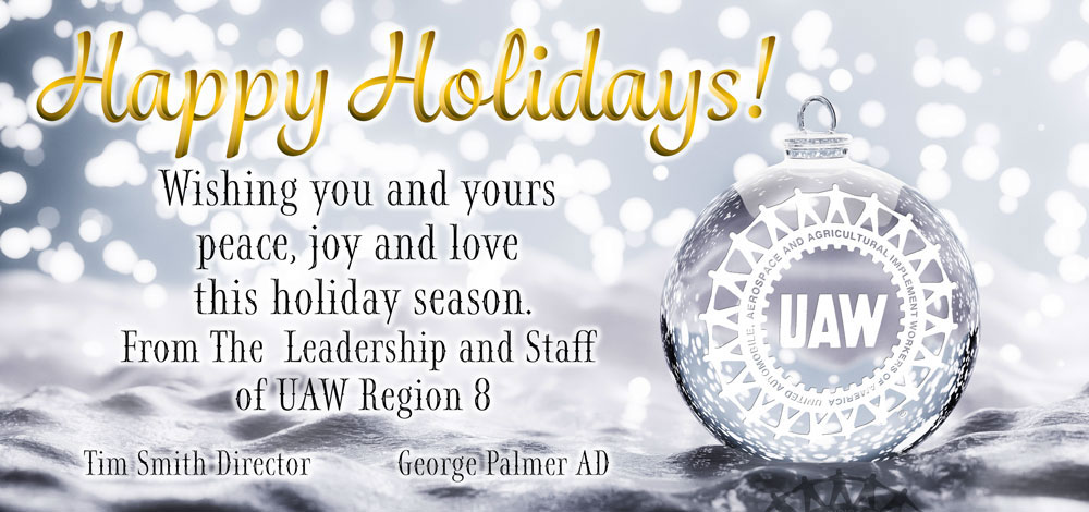 On behalf of the leadership and staff of UAW Region 8, we wish you all tidings of great joy this holiday season. May you find peace and comfort in the days ahead. Remember, every day can be like Christmas if we carry love and solidarity within our hearts throughout the year.