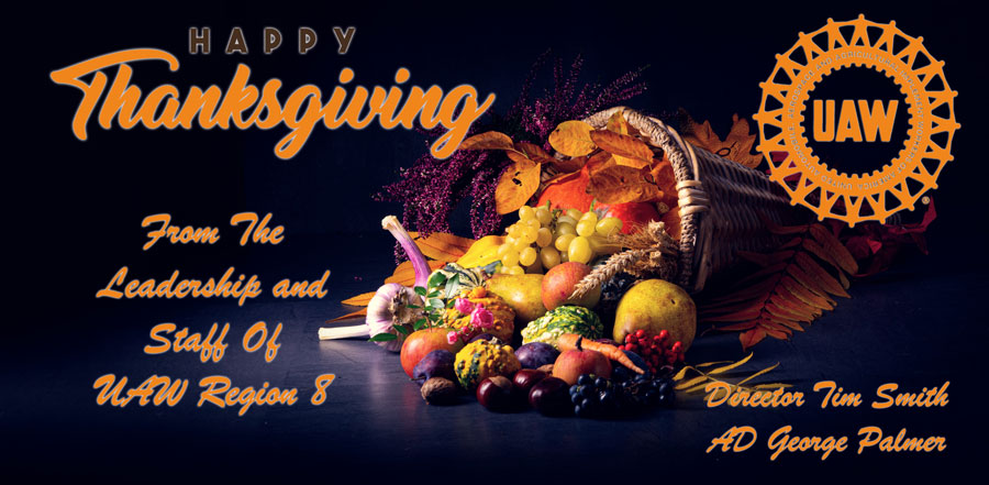 This Thanksgiving, I hope each and every one of have a chance to share a meal with your friends and loved ones. Make those memories that will last a lifetime, particularly as you lose those close to you. At the same time, may we remember those who will be faced with hunger this Thanksgiving. On that day and every day may we always be mindful of our fellow Americans who are less fortunate than us. On behalf of the leadership and staff of UAW Region 8, I wish you all Thanksgiving memories to last a lifetime.